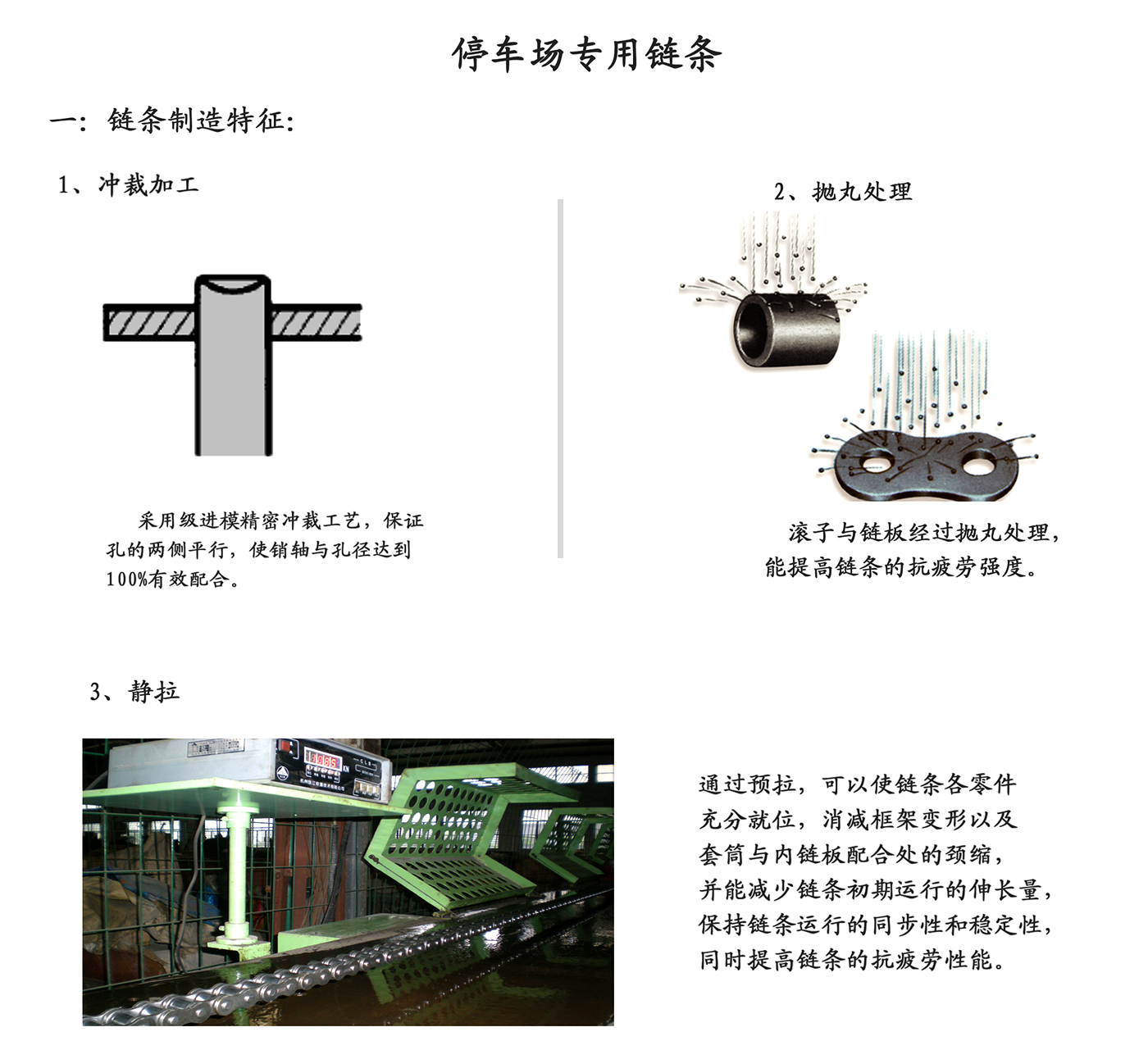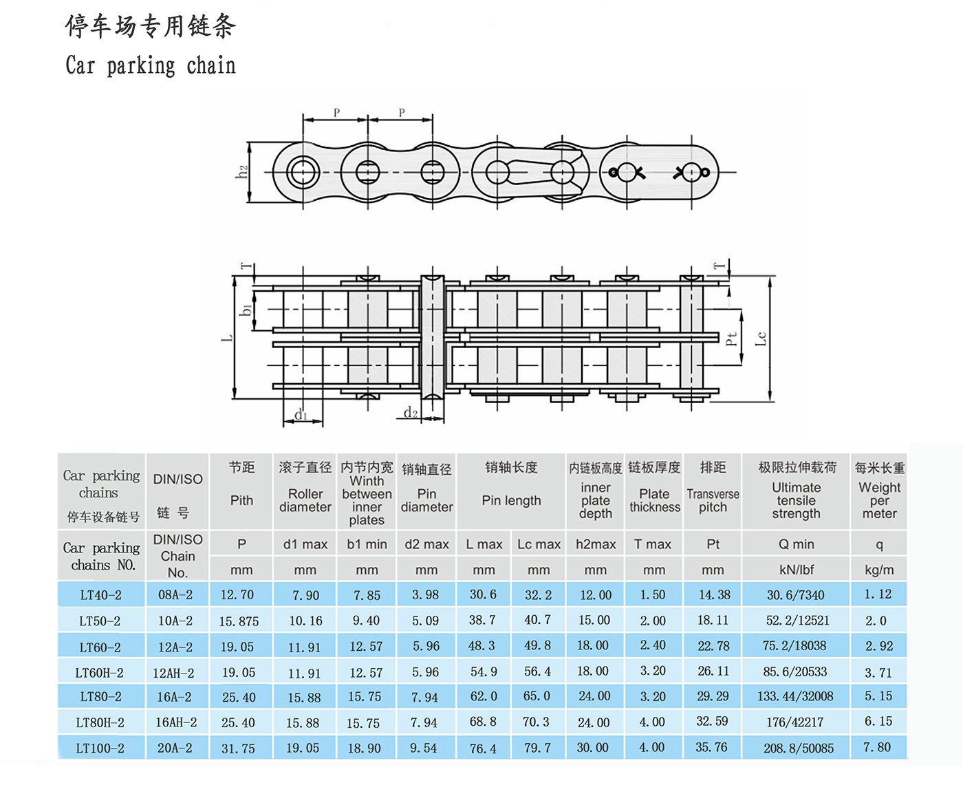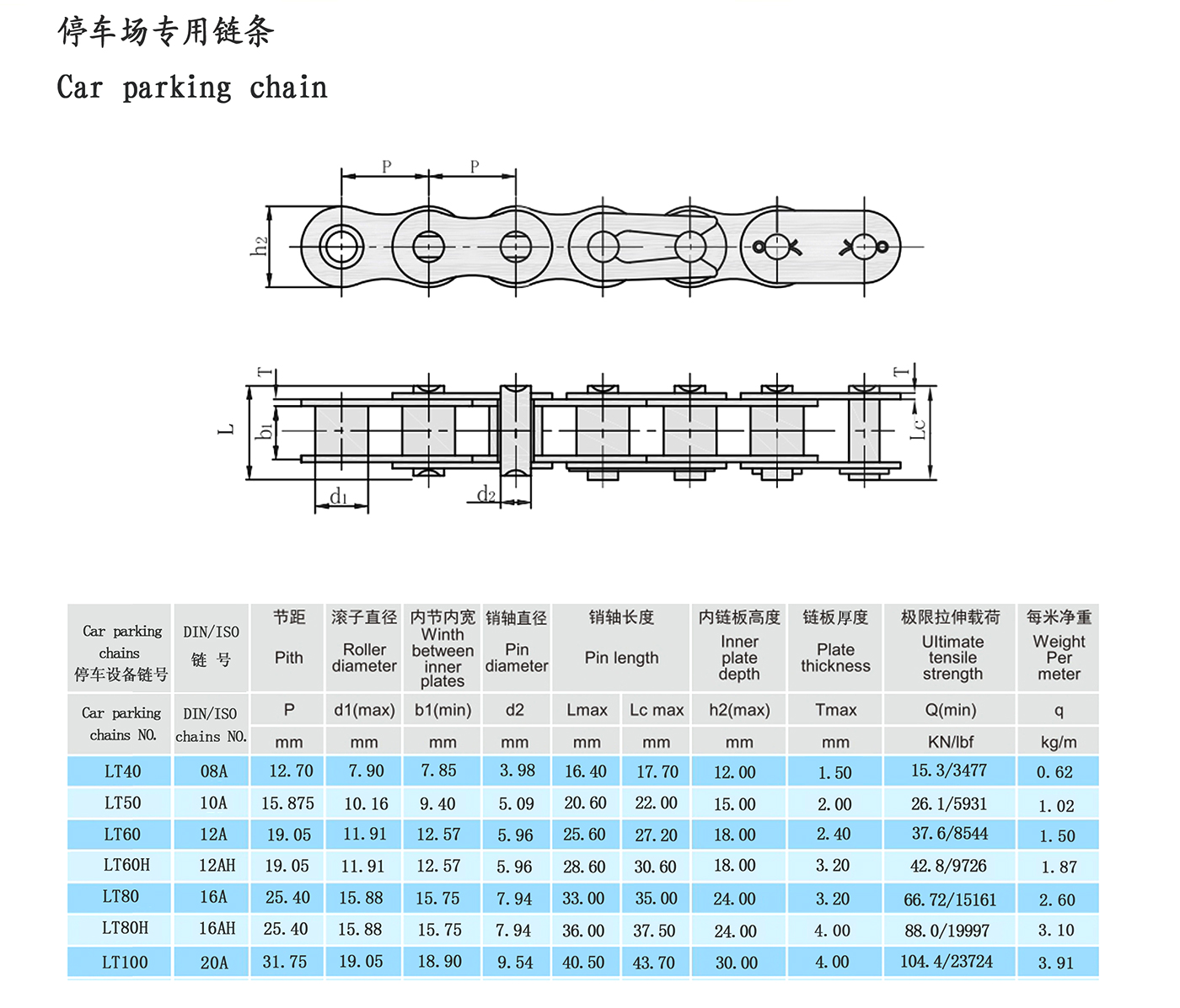 Lanțul echipamentului inteligent de parcare tridimensional este transmisia din a doua etapă a corpului principal al echipamentului de parcare. Standardul de implementare este JB/T11079-2011. Caracteristicile de utilizare ale lanțului: capacitate mare de transport, rezistență mare la tracțiune (rezistență statică), rezistența minimă la tracțiune este cu 10%-30% mai mare decât lanțurile cu role de precizie obișnuite, indicele de distorsiune, precizia lungimii lanțului, rezistența la oboseală etc. sunt, de asemenea, mai mari decât lanțurile cu role obișnuite de precizie.